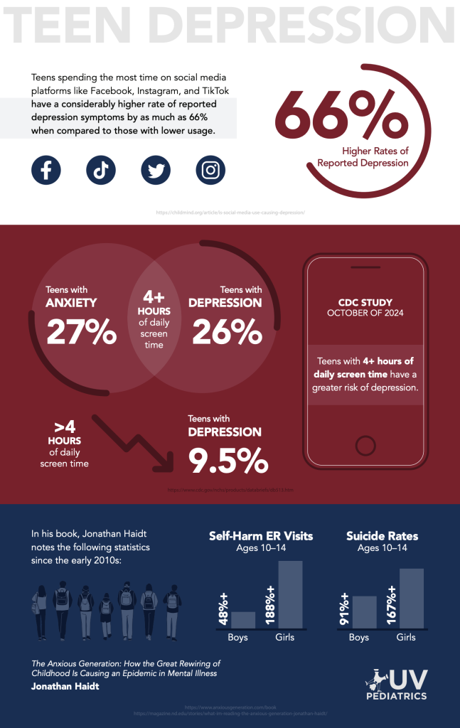 To raise awareness about this growing issue, Utah Valley Pediatrics is shining a light on teen depression and its links to social media. This is the first of two articles exploring the connection between social media and teen anxiety, offering insights into its impact and practical steps for parents.