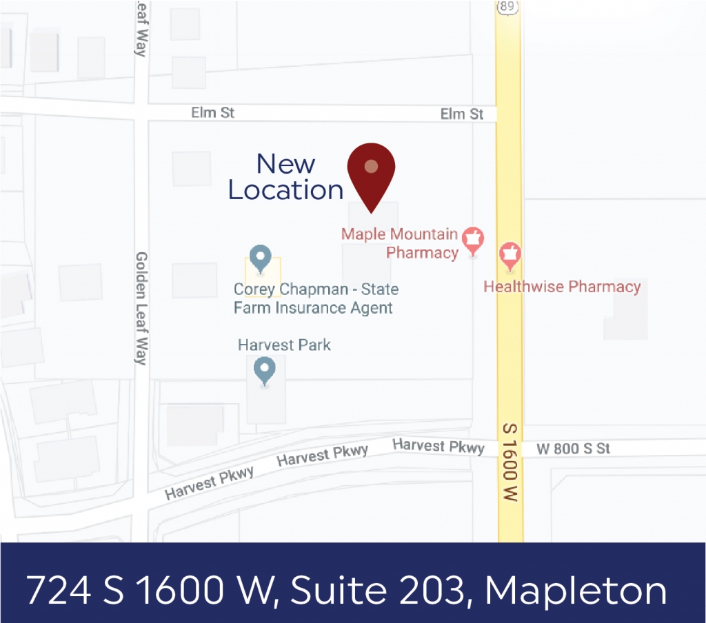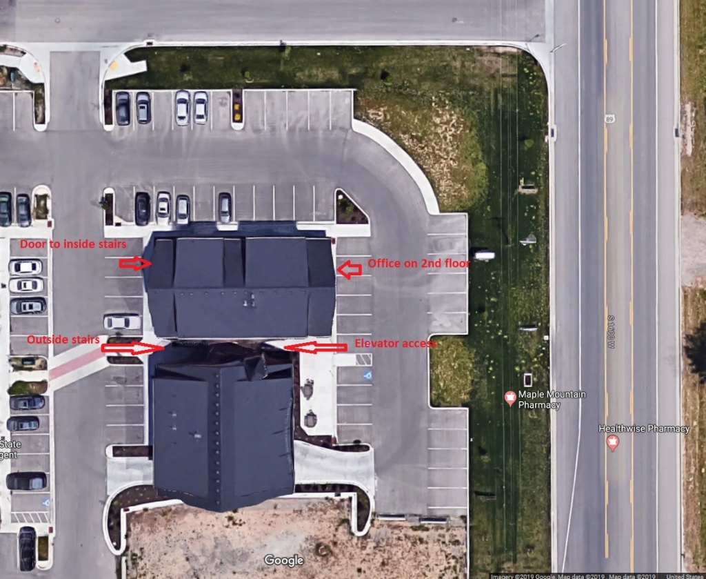 The Mapleton office is located at 724 South 1600 West, Suite 203 (on the 2nd floor of the building). Elevator access and outside stairs can be found on the south side of the building (inbetween the new Mapleton office and Maple Mountain Pharmacy). The door to the inside stairs is located on the west side of the building.